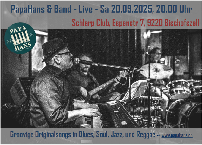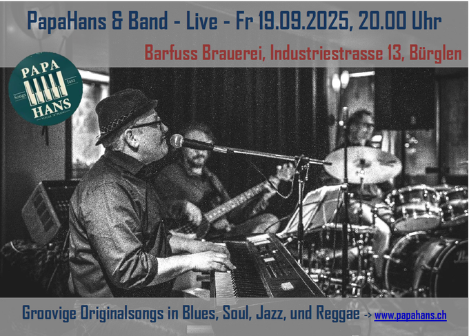 Aktuell ist Papa Hans auch im Trio Papa Hans & Band unterwegs. Mit den beiden langjährigen Weggefährten Heinrich Hutterli am Bass und Beat Bögli am Schlagzeug gründen wir bereits die dritte Band zusammen. Schon bei den Cover-Bands "The Duschvorhang" und "Froilein Heidelberger" waren wir bei der Gründung beteiligt. Bei Papa Hans & Band spielen wir aber mehrheitlich Papa Hans Songs. Dies sind alles deutsche Lieder mit Themen für Erwachsene, welche nachdenklich, kritisch, emotional und lustig sein können. Sie sind aber immer groovig aus einer Mischung aus Soul, Blues, Jazz und Reggae. Man könnte den Stil als Deutsch-Soul bezeichnen. Ergänzend haben wir auch noch eine handvoll Klassiker wie z.B. Route66, My funny Valentine oder Valerie dabei, welche aber jeweils in einem neuem Gewand daher kommen. Die Musik ist zum Zuhören oder zum Tanzen gedacht und wenn Leute das Tanzbein schwingen, können wir die Soloteile durchaus zu Groove-Interplay-Esktasen ausufern lassen. Mit der kleinen Formation sind wir sehr flexibel und finden in kleinen und grossen Orten Platz. Wir spielen an Hauspartys, Clubgigs, Open Airs, Firmenevents, Vereinsanlässe usw. Was wir sicher nicht können ist Schlager, Covers, Klassik und den Ententanz.