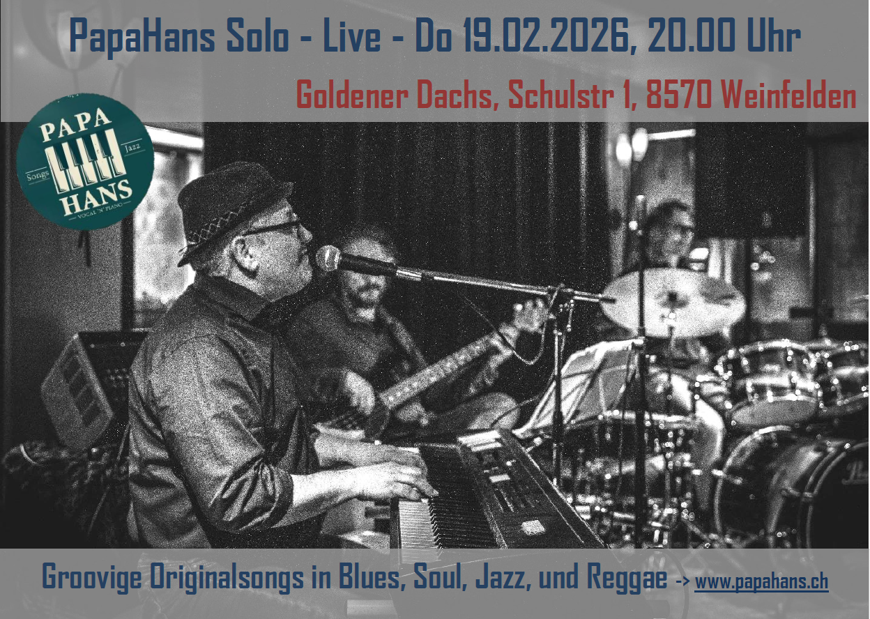 Ich spiele und singe solo als PapaHans am Do 19.02.2026 meine Lieblingssongs. Im gemütlichen Lokal Goldener Dachs mitten in Weinfelden spiele ich am Steinway-Flügel 3 Sets und man kann einfach zuhören oder sich unterhalten. Es gibt kein Eintritt aber ich werde nach den Sets jeweils mit dem Hut vorbeikommen.